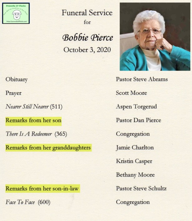 As is normally the case, there were many wonderful memories shared during the funeral. Bobbie was dearly loved and appreciated by her children, grandchildren, and her friends. Three granddaughters spoke highly of her, but not without a dose of reality. She was a loving mother and grandmother, but she was also a sinner. She needed a Savior who is able to save to the uttermost. Her obituary starts with that important reminder.