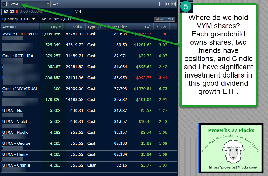 - Find Positions in All Accounts: Most investors have 2-3 accounts. I manage six accounts for my wife and me, six accounts for our grandchildren, two accounts for Cindie’s brother and even some accounts for friends who want my help. I cannot always remember who has what, so this tool saves time knowing where I hold positions. For example, I hold ETF’s like VYM in more than five accounts including the UTMA accounts for our grandchildren. This tool rates an “A” because I use it every time a dividend is announced. See the screen shot below.