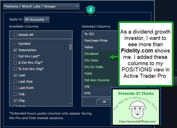 - Portfolio Positions and Watch Lists: It is true that you can see and download positions from Fidelity’s web positions page. But this tool is turbocharged. You can select and sequence the fields you want to see and can see individual accounts or all accounts. You have more fields to select than you can get from the standard Fidelity web positions download. I download data from this to CSV so that I can analyze dividend-specific aspects of our holdings. The two screens here show some of the power of this tool. But it doesn’t stop there. You can also enter and monitor watch lists from this tool. It is an “A++” in my mind. See the two screen shots below.