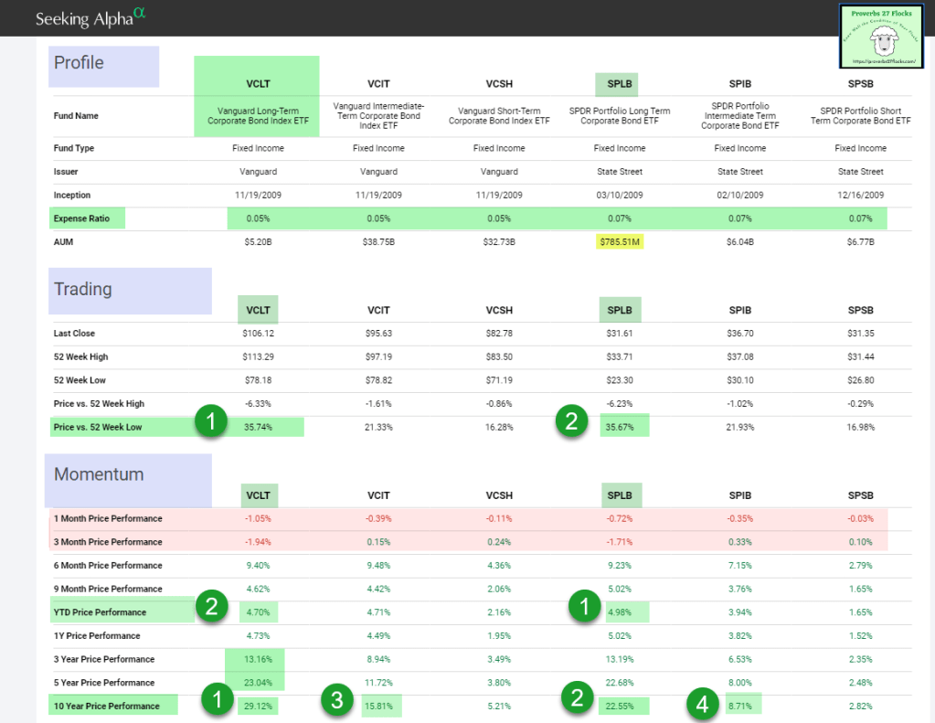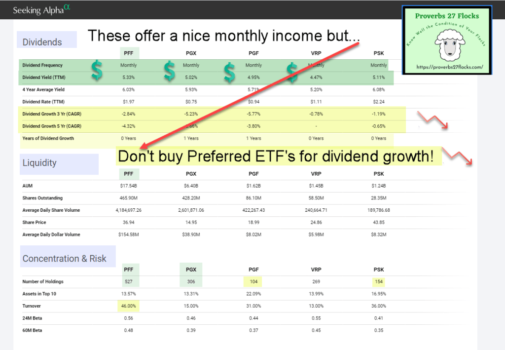 The two ETFs I personally use are VCLT and PFF. VCLT is a Vanguard long-term corporate bond fund. PFF is a highly diversified, preferred stock fund. Think of it this way: when it comes to risk, cash is least likely to lose the principal value, bonds are next in line, preferred stocks follow, then large cap value stocks followed by large cap growth stocks. So, if you don’t want to invest in VYM or DGRO (common stock dividend growth funds), but you want income, consider VCLT and PFF. To help you see these two ETFs in contrast with other similar funds, review the following images.