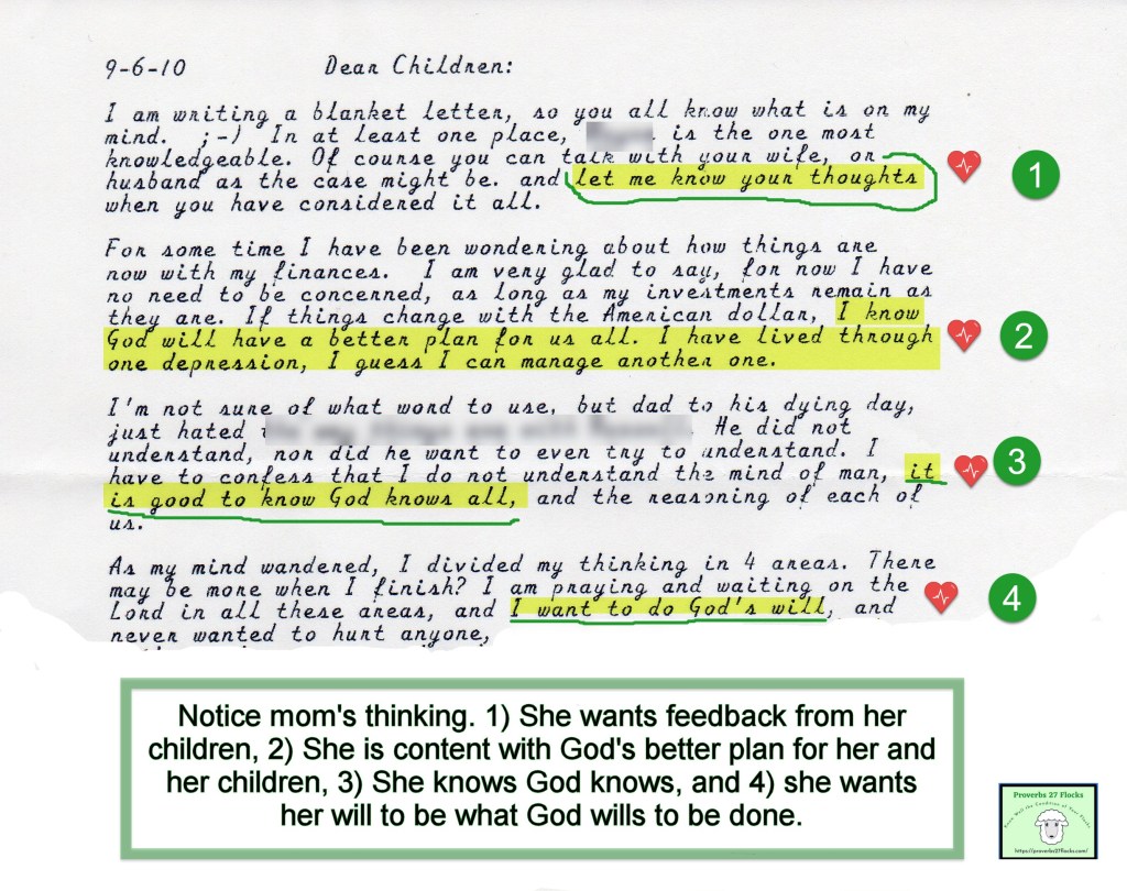 Mom was never too old to seek and accept advice. Yesterday I was cleaning out an old briefcase and came upon a letter mom had written to each of us, her children. As you can see from the portion of this long letter, she was seeking advice. Her concerns were regarding her will and how this document intertwined with some difficult family needs. I recall many times when mom asked me for my opinion and advice regarding financial matters. She knew one thing with certainty: she didn’t know everything. I was also reminded of this when I was reading in Proverbs this morning.