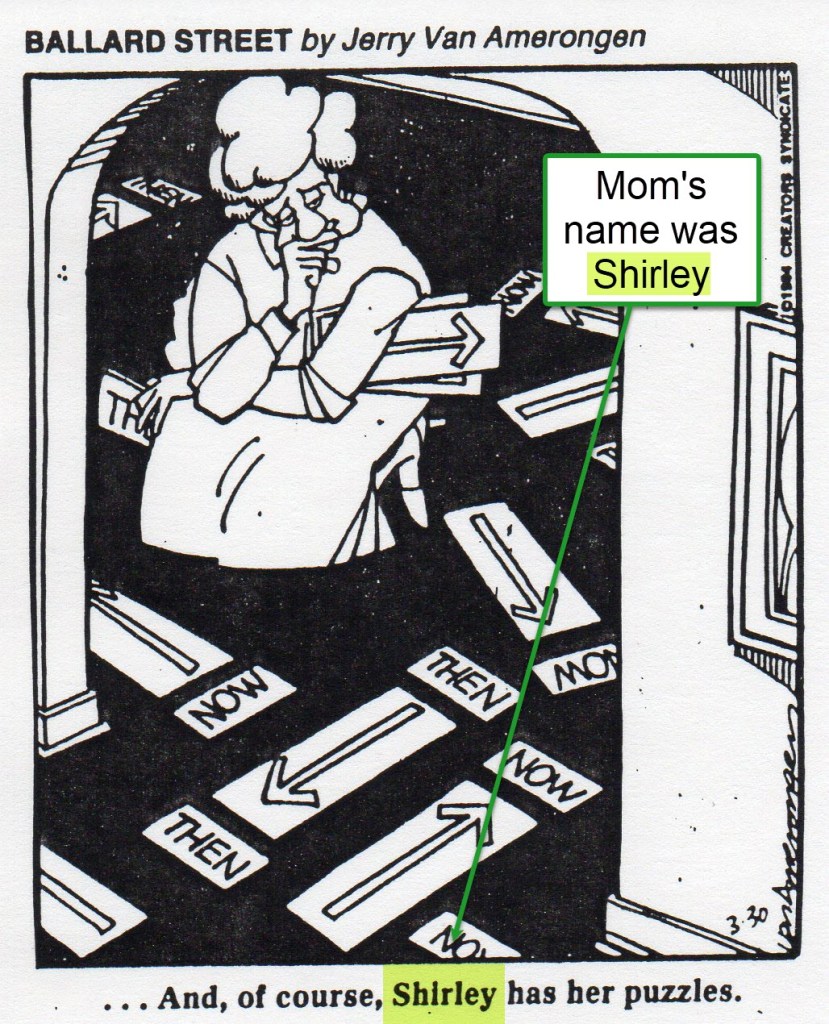 Yesterday my wife gave me a treasure. In her stationary Cindie had some old scratch paper sheets my mom created from some old cartoons she liked. When I saw them, I heard mom laugh. This also, for some reason, caused me to remember another trait of mom that was full of wisdom. She listened to advice. More than that, she asked for it. Here is one of the cartoons my mom had on her scratch sheets. Her name was Shirley, and she related to the Shirley in the cartoon.