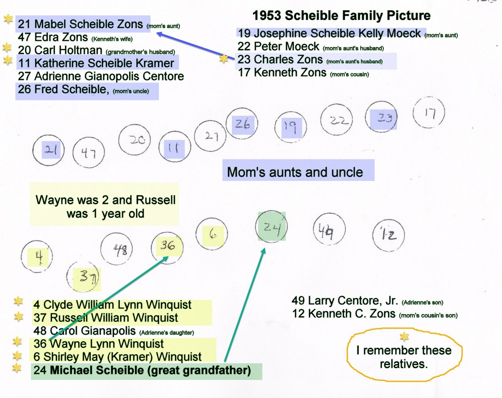 When I was about two years old and my brother was one, a picture was taken of the family with Great Grandfather Michael positioned in the middle. My brother Russell, Dad, Mom, and I are in the picture. My mother’s mom, two aunts and uncle are present as well. I’m thankful that mom took the time to not only give us the picture, but to identify each person in a key she provided. Those images are shown here.