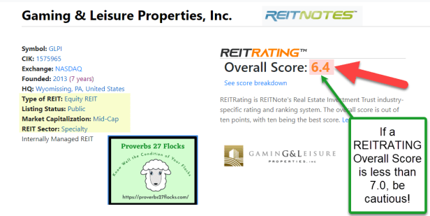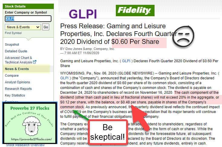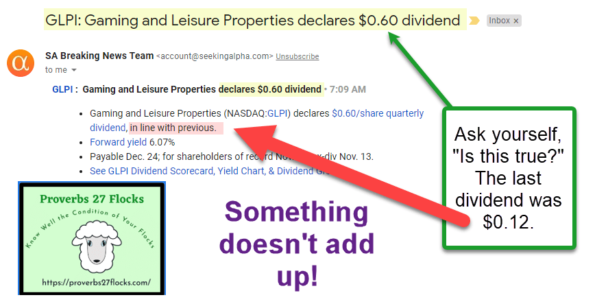 Sometimes words can say something that is true, but they are designed to make you see something with tunnel vision. For example, the words, “Buy one, get one free,” sound so sweet until you realize that you are getting 50% off of a product that is designed to capture more of your dollars. At Perkin’s one of their Wednesday specials is, “Buy one entrée and get a second entrée free.” Well, not really. You have to buy two high-margin drinks to get the second entrée free. Menards (Save Big Money at Menards!) offers “11% off” specials. But the reality is that you get the 11% off if you submit their required paperwork and wait weeks for the coupon you can use at Menards to buy more at retail prices. Did you really get 11% off? No. The same cautions apply to investing. Here is an example using a recent dividend announcement from a REIT with the ticker symbol GLPI (Gaming and Leisure Properties, Inc.)