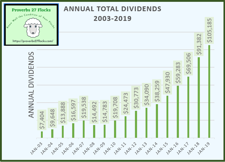 However, bear in mind that little income has been drawn from our IRA’s and ROTH IRA’s in the last seventeen years. Therefore, the dividends were either reinvested automatically, or dividend income was used to purchase more dividend-paying investments. Because I have been receiving Social Security, the dollars needed for our lifestyle during retirement were reduced. This freed up investment dollars to fuel the dividend growth engine.