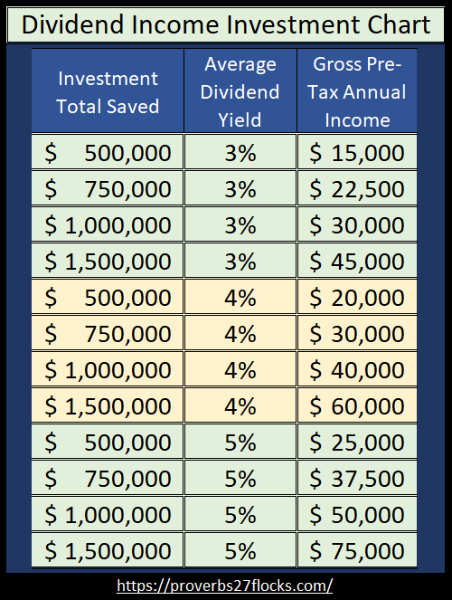 This chart gives you a rough idea of the power of your investment portfolio, assuming either a 3%, 4% or 5% rate of return. I have found that an overall rate of return of 2.5% is easy to obtain. Because I am willing to invest in REITs and BDCs, and they pay substantial dividends, it is also easy to achieve 4.5% or more. For planning purposes, it might be best to think you can achieve 3%.