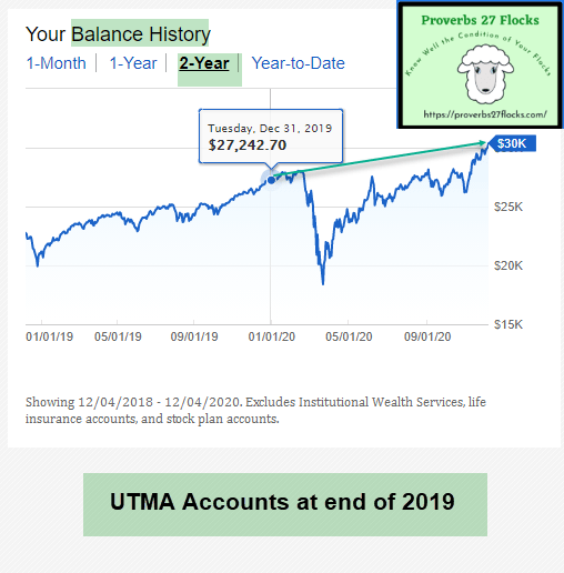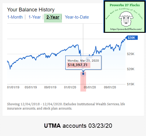 The nice thing about picking quality assets is that I can ignore market volatility. The next four images show the results of ignoring downturns. One is of a specific UTMA account showing the balance activity and performance since the account was opened. The next three illustrate what a roller coaster ride the market has been. At the end of 2019, the accounts looked healthy. But on March 23 of this year it seemed that I had picked awful investments. I ignored the market and stayed the course. The accounts at the end of November 2020 have now poked their heads about $30,000 in total.