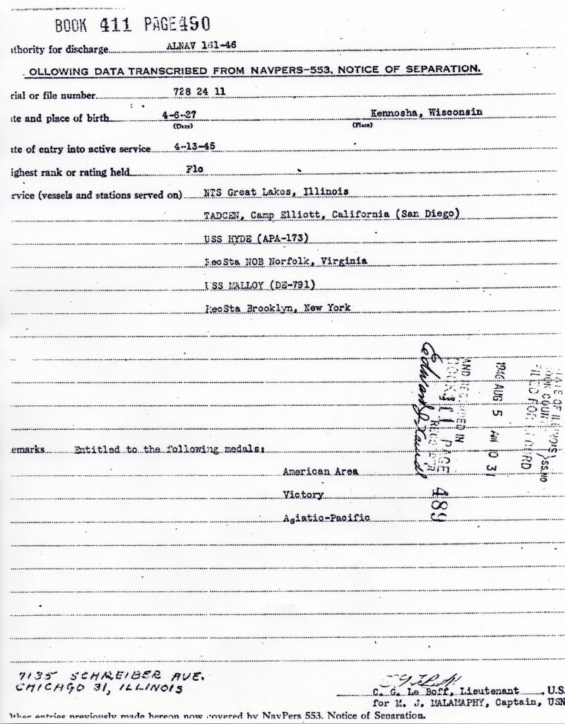 I’m not certain how or why, but Dad’s next station was Norfolk, VA with a short time aboard the USS Malloy. I recognized the type of ship because it was numbered DE-791. During the Vietnam war, I served on a Destroyer Escort as well, the USS Bagley, DE-1069. Finally, in August of 1946, dad was discharged back to civilian life in Brooklyn New York and returned to Chicago. That was when he met my mom at a roller-skating rink. They were married in 1949 and had four children: three sons and a daughter.
