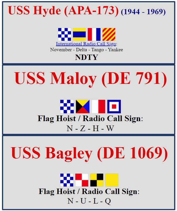 One of the ways we could identify a ship was by its “radio call sign.” If you were speaking to N-U-L-Q, you were talking to the USS Bagley. We would fly the NULQ signal flags when we were underway. When we were close to another ship, we could use high-powered, mounted, night-vision binoculars to read the flags on the ship in the distance. We could then look up the ship’s name and information in our signal code book. Here are the radio call signs for dad’s two ships and the one I was on during the Vietnam war.