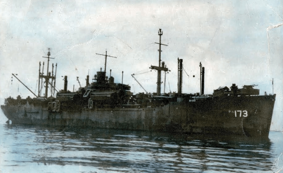 After that he went on to San Diego’s Camp Elliott TADCEN (Training and Distribution Center). I don’t know if he received additional training there, but I suspect he did. His first duty station after training was aboard the USS Hyde (APA-173). APA stands for amphibious assault ship. USS Hyde was a Haskell-class attack transport acquired by the U.S. Navy during World War II for the task of transporting troops to and from combat areas. During World War II his ship was assigned to the Asiatic-Pacific Theater. The following images show the destroyer escort (DE-791) and the APA my dad served aboard in WWII.