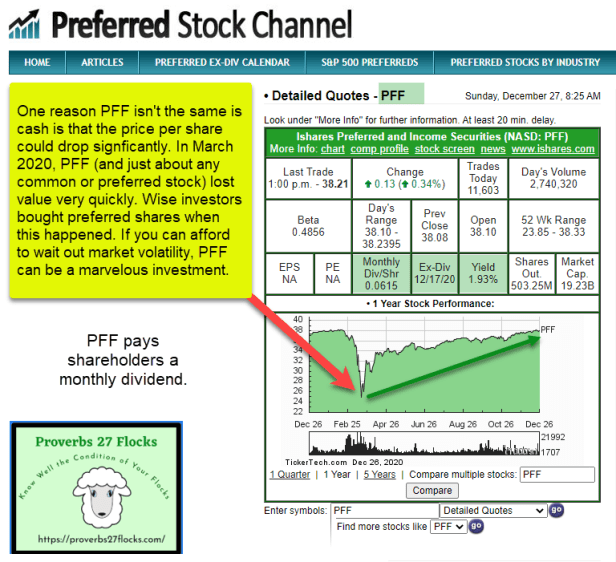 It is possible to buy preferred shares in any company that offers this type of stock ownership. One resource to investigate preferred shares is the website “Preferred Stock Channel.” A link is provided at the end of this article. However, for the average investor, including me, using an ETF that holds preferred shares from many different companies is far less risky. There is still a degree of risk, and this became very evident during the Covid-19 market turbulence earlier this year. However, if you have cash that is sitting idle, putting a portion to work in an ETF like PFF might make sense. For example, I hold 400 shares of PFF in my traditional IRA.