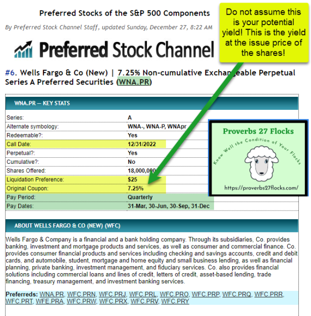 Wells Fargo has various issues of preferred stock. One reason the novice investor should not purchase a single preferred issue has to do with the value of the shares and the dividend yield. If the shares have increased in value and are now selling at more than $25 per share, then the yield will be less than the “Original Coupon” yield. In this example, the Wells Fargo Preferred series A stock had an original coupon yield of 7.25%. If you pay more than $25 per share, your yield will be less. Furthermore, the company may “call” your shares and pay you $25 per share. They don’t care how much you paid for the shares on the open market. Be careful before you buy an individual preferred stock investment. Recommendation: Buy a preferred shares ETF like PFF instead.