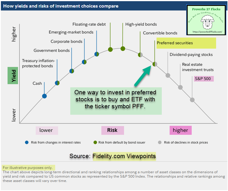 Don’t forget that cash is a handy tool. If I see a great investment opportunity but am cash-poor, I don’t have a way to purchase the investment without selling an existing investment. For that reason, I usually like to keep 3-4% of our total portfolio in cash (FDRXX or SPAXX). But perhaps even here I am missing some income potential. There are some investments with less short-term risk than the S&P 500, dividend-paying common stocks, and REITS. One such investment is preferred stocks. If you are a store’s preferred customer, you should expect something for that status. If you are a preferred stock owner, the same applies.