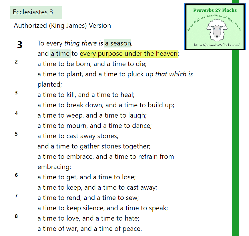 In the book of Ecclesiastes, the son of David, probably Solomon, understood that we have a brief season and a time. It starts with a time to be born. It ends with a time to die. In between there are ways to use time and events that cause us to consider the ways we are moving through our one life. These all involve God “under heaven” and people “a time to.” All of this is a gift of God. God is working. I should fear God and do good in this life while he makes everything beautiful in his patient, loving, and all-wise time.