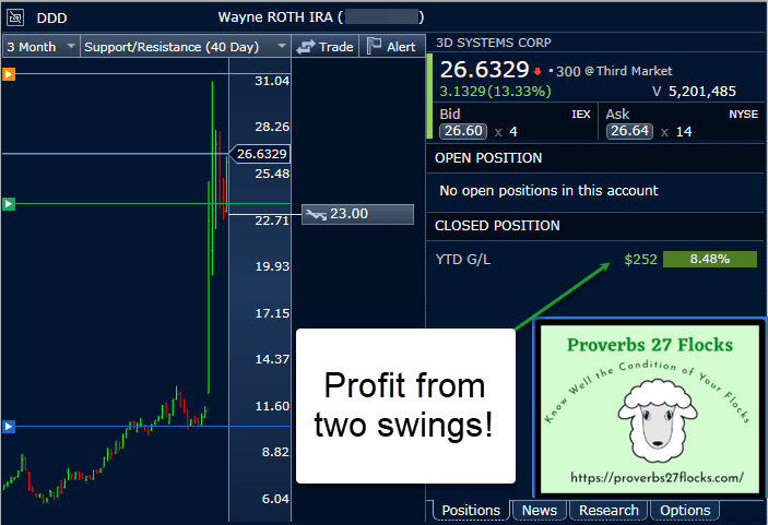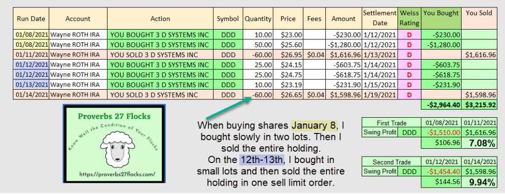 Will I do another swing trade with DDD next week? Perhaps. I will become interested if the price drops to $25-26 per share. I will buy in small bites and won’t buy more than 60 shares. The following shows my results for the first two weeks of January. This is all pure profit with no income tax liability. My ROTH IRA is a good place for this strategy.