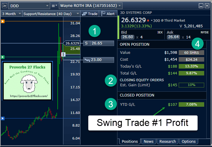 As you can see, I had a sell limit order to sell my shares at $26.65 (1). If I got my price, I could expect to realize a profit of about $145 (2). My first swing trade gave me a profit of $107, so this trade could be more profitable (3). Bear in mind that my total investment dollars (4) was reasonably small compared to our total investment portfolio.