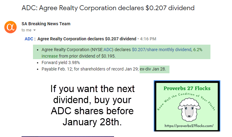 ADC announced a dividend increase of 6.2% from prior dividend of $0.195. This gives ADC a forward yield 3.98%. The dividend is payable Feb. 12 for shareholders of record Jan 29 and goes Ex-Dividend Jan 28.