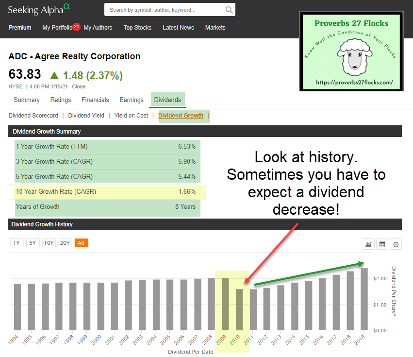 The following Seeking Alpha screen shots reveal some important characteristics of ADC as an investment. First of all, ADC has an eight-year history of increasing dividends. Not too long ago the dividend was decreased. Always be mindful of that possibility with any investment. The business model is solid with a focus on real estate that I believe is a good long-term model for continued growth. The dividend payout ratio and dividend growth rate are both good. Therefore, I will continue to collect the dividends and enjoy the dividend growth. If you are a growth investor, then ADC is not for you. But if you want income from your investments, then good REITs can make a difference in your income stream. Here are five slides with data elements I look at when buying an investment.