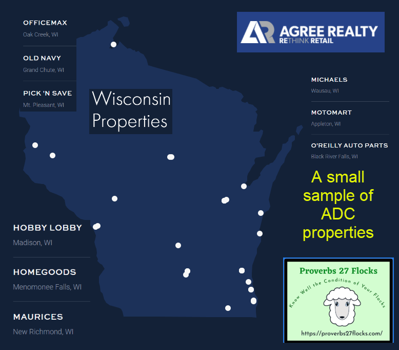 Do you recognize the names of the retail businesses that lease their buildings from ADC? I think you will. My guess is that you shop in at least some of them: Aldi, Home Depot, McDonald’s, TJMaxx, Walmart, Costco, Michael’s, Old Navy, Pick n Save, Hobby Lobby, Home Goods, Motomart, and O’Reilly Auto Parts are just the tip of their retail iceberg. I shop at Aldi, Home Depot, Walmart, McDonald’s, and Hobby Lobby. They are busy and profitable businesses, even during Covid-19.