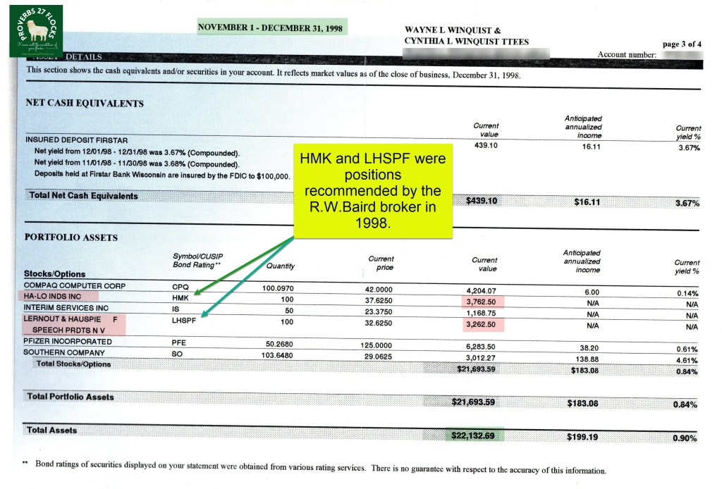 To make matters worse, the Baird broker started recommending investments in companies that were financial disasters. He offered me a “commission free” trade to entice me to buy shares of HA-LO Industries, Inc. He also sold me on the idea of Lernout & Hauspie Speech with some awful commission charges. My total cost for all of those shares was $7,543.50. To put this in perspective, these two companies represented 36% of my total investment dollars in 1998. Both companies went bankrupt for different reasons and I lost the entire investment. When you consider that I invested in six companies, having one third of them go bankrupt is incredible. In hindsight, I see how foolish I was and how poor the advice I received was. In April 1999 I resigned my position at UFC and took a job at Conney Safety Products in Madison WI. In September 1999 I opened my rollover IRA account at Fidelity Investments.
