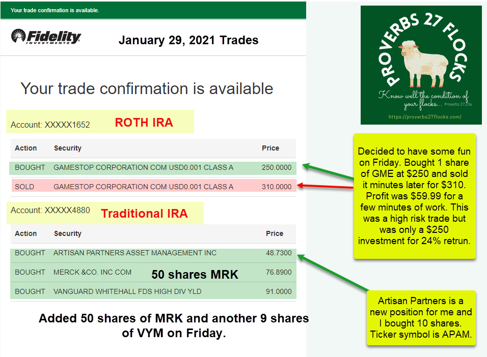 On Friday, January 29, 2021 I purchased one share of GME for $250 at about 1:30 PM CST. About 40 minutes later I sold the share for $310, netting a gross profit of $60. My net profit was $59.99 for this trade after the sale charge. That is a gain of 24% on one share of stock. You can see why this can be a tempting way to make money. However, day trading is extremely risky. That is why I only purchased one share of GME.