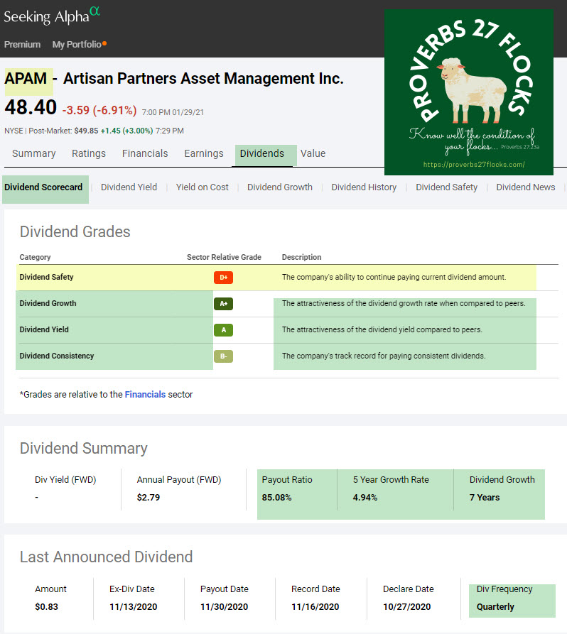 APAM has a dividend yield of 5.95% and a dividend payout ratio of 85.08%. APAM has a 7-year record of increasing dividends, and a desirable 5-year growth rate of 4.94%. A comparable company would be AB (Alliance Bernstein Holding L.P.) This investment is in the Financial sector and is in the “Asset Management and Custody Banks” industry.