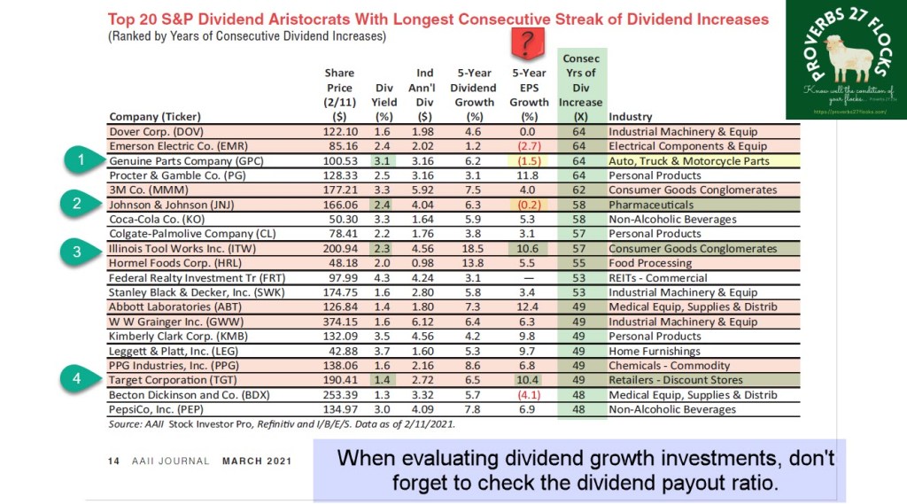 All lists have flaws, especially any list that says it includes the “top” of anything. Much of this depends on the criteria for selecting the top ten or top whatever. In the attached image, we own shares of GPC, JNJ, ITW, and TGT. To say I am pleased with these investments is a gross understatement. They have done very well. But this list does not give the reader the important dividend payout ratio. Therefore, do not buy any investment on this list if you don’t understand that concept. Furthermore, you should pay attention to the column labeled “5-year EPS growth.” You may want to pause before you buy GPC or JNJ.