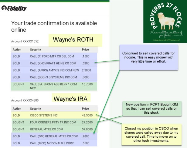 Cindie’s ROTH IRA has now been approved for the sale of covered calls. I will go slow with her trades, but there are some good candidates in her ROTH IRA for this strategy as well.
