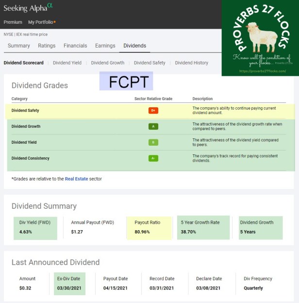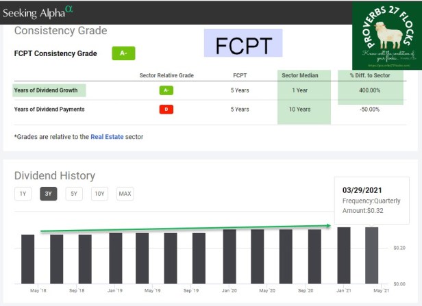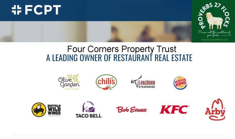 Cindie and I own 150 shares of FCPT as a long-term investment. This is one of our smaller holdings.