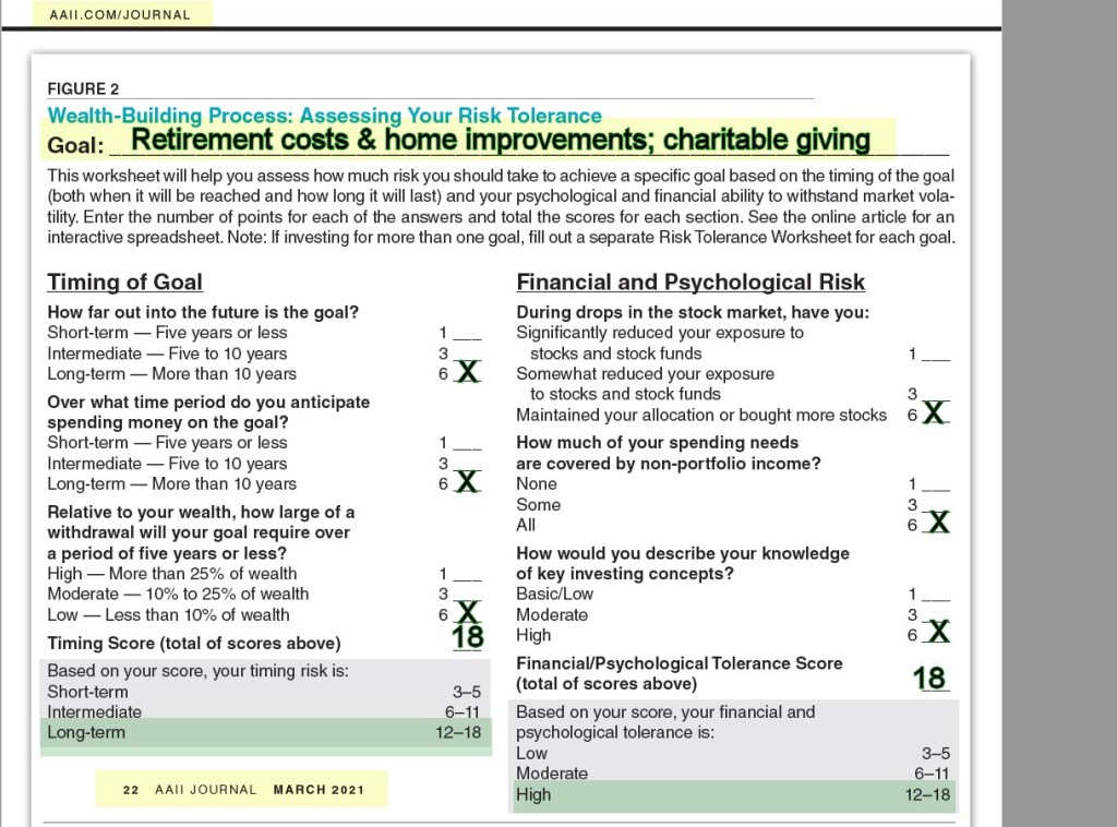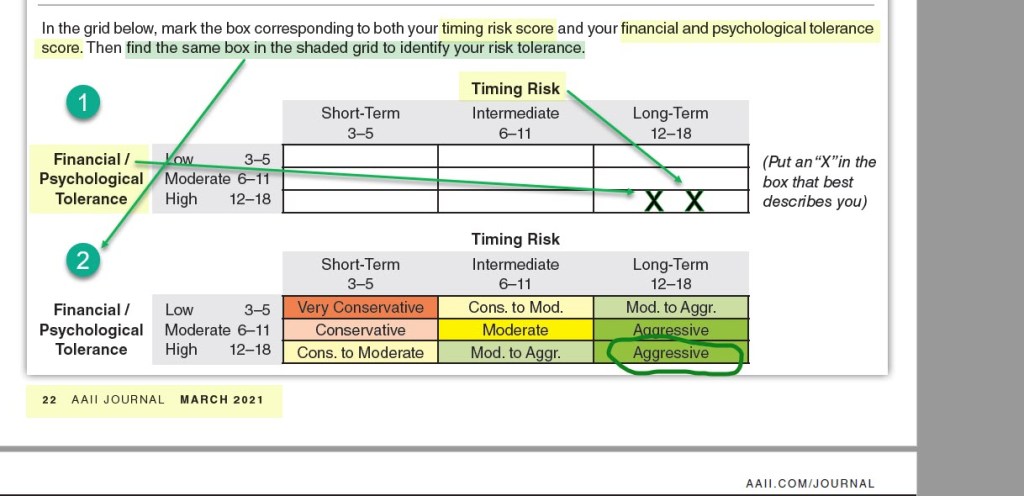 AAII has a nice tool that helps an investor determine where they fall based on specific goals. In the March 2021 AAII Journal a worksheet was provided. I completed the worksheet to illustrate how I respond to risk, which then helps me define the types of investments I will purchase for our retirement accounts.