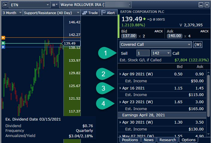 ETN’s yield is a reasonable 2.18% based on the current price of $139.49 per share. However, the P/E ratio is 24.87, which seems a bit rich at this point. This doesn’t mean I would necessarily run from the investment, but I want to grab some additional income if the risk/reward is appropriate. Therefore, on March 15, 2021, I sold three covered call contracts for my ETN shares. Two of them were for 200 shares each and one was for the remaining 100 shares. The total income, after commissions and fees was $746.52. This is about half of the annualized dividend, and I did not have to wait to receive it.