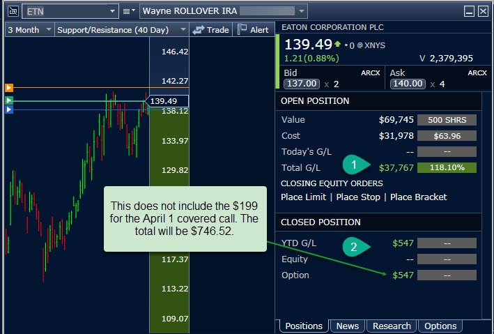 Cindie and I own 500 shares of ETN as a long-term investment. However, the covered call strategy may result in a reduction in our ownership if some or all of the shares are called away through the sale of covered calls. #1 is the current unrealized profit and #2 is the profit from the sale of covered calls excluding the most recent profit of $199.