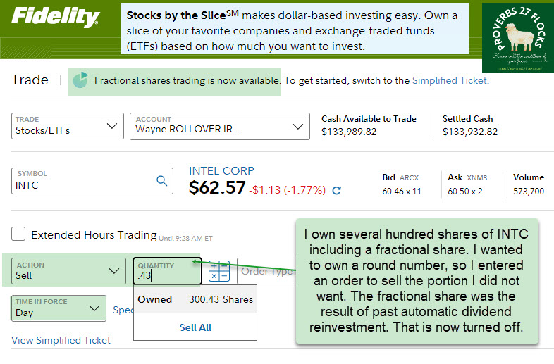 The Balance lists seven “Best Fractional Share Investing Brokerages for 2021.” They say Charles Schwab is the “best overall,” but I disagree. Schwab has limits on the shares you can trade. The Balance also lists Fidelity as “best for investment goals” and Interactive Brokers for “best for active traders.” Fidelity is better than Schwab because Fidelity allows for more than 7,000 fractional share stocks and ETFs. This past week I tested Fidelity’s trading functionality and sold a fractional share of my VM holdings. I worked like a champ. Note, however, that fractional share trading is not currently offered on Fidelity’s Active Trader Pro platform. You have to do the trades on the Fidelity web site.