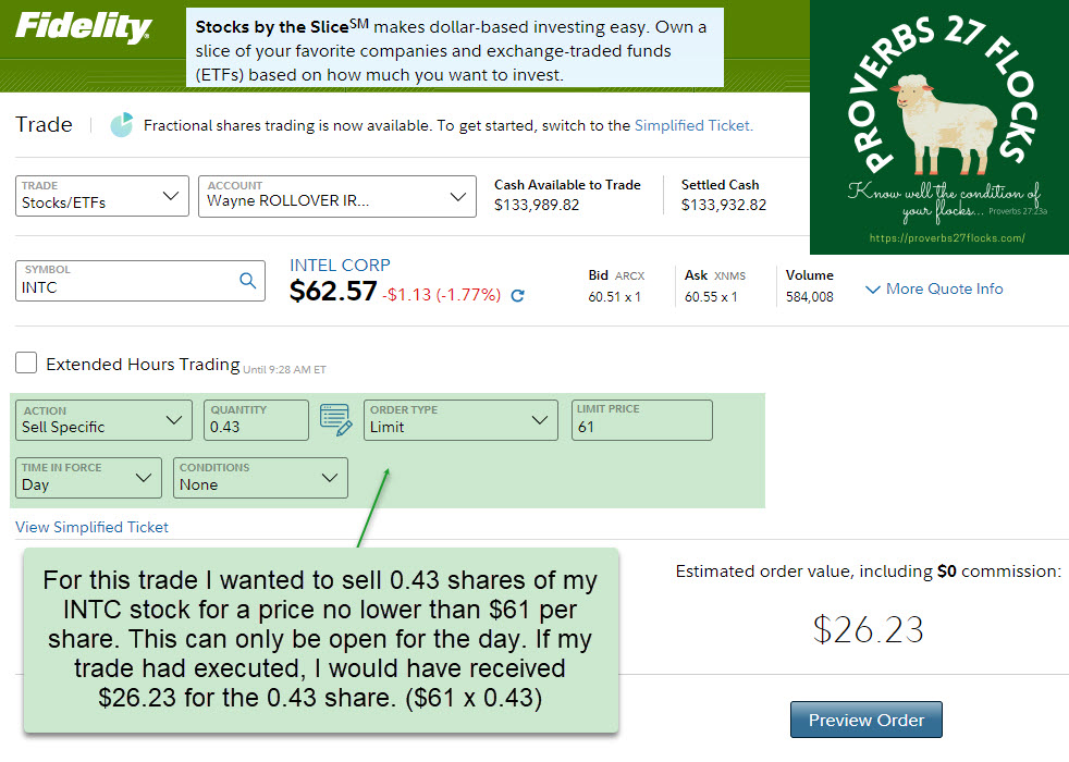 I tested Fidelity two times. The first test was the sale of a fractional share of VYM. The second order was a test of stock INTC. Because I used a sell limit order, and the fractional share trade is only good for one day, the stock did not sell. I will try again this week.