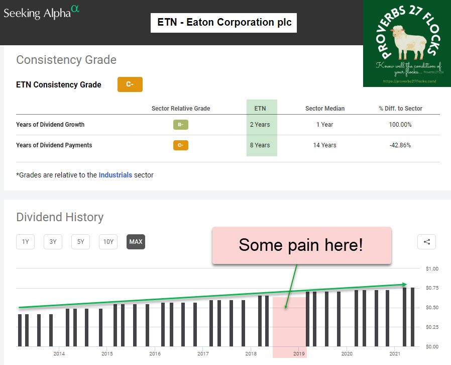 According to Seeking Alpha, there are 528 Industrial investments you can choose from. Of those, 36 are “Electrical Components and Equipment” companies. ETN is currently ranked as 165 in the industrials. In the industry section they are in the top ten. ETN is number 9 out of the 36. Some other industrials that we own include: EBF, ITW, MRTN, PLUG, R, RSG, TITN, TRTN, and WM. PLUG and R are short-term speculative positions.