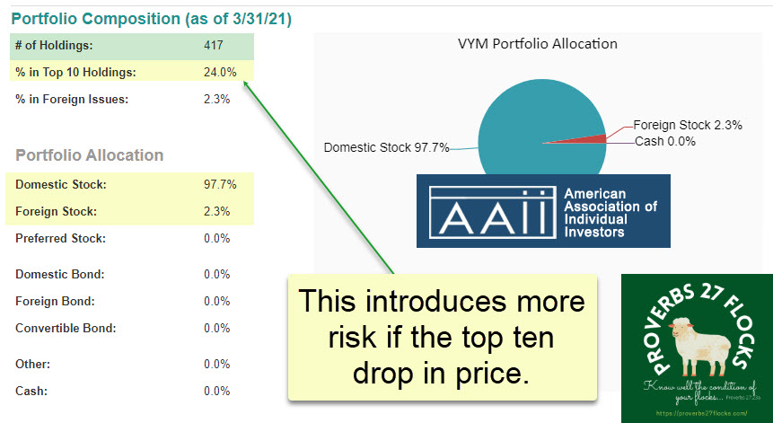 VYM offers some diversification (400+) holdings, but there is a risk factor. About 25% of the assets are in ten companies. I do like the fact that most of the investments are domestic stocks. This image was captured from the AAII website.