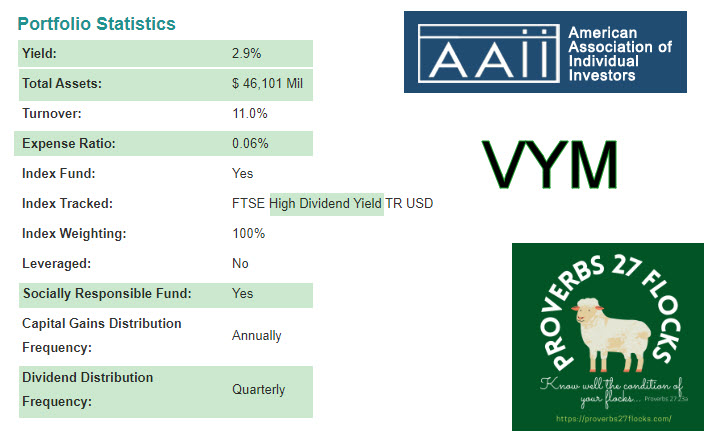 VYM currently sports a dividend yield of 2.9%. The following image from my AAII membership shows it is a “Socially Responsible Fund.” The goal is high dividend yield with a very rational expense ratio of 0.06%. Anything less than 0.10% is a “good” start.