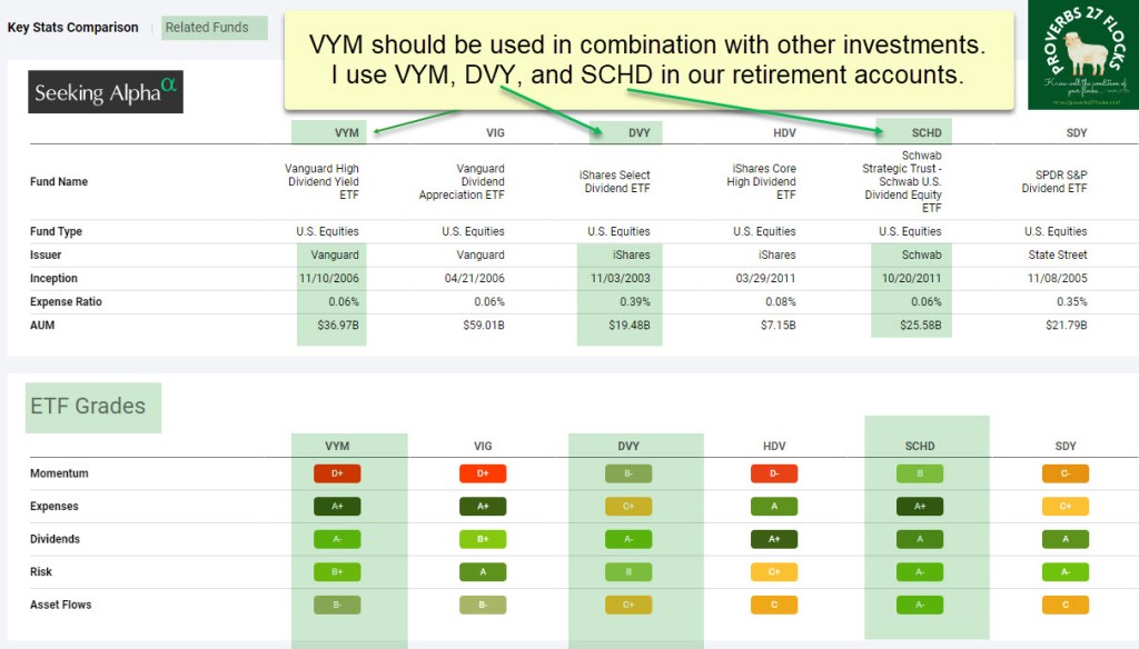 As you can see from this Seeking Alpha screenshot, VYM is not currently a momentum darling. However, Cindie and I also own shares of DVY and SCHD. This adds diversification and more of a growth factor to our overall investments. The expense ratio for DVY is a bit high, but that is OK. We also own shares of ETF DGRO. All of the related funds are worth considering. I just happen to prefer VYM.