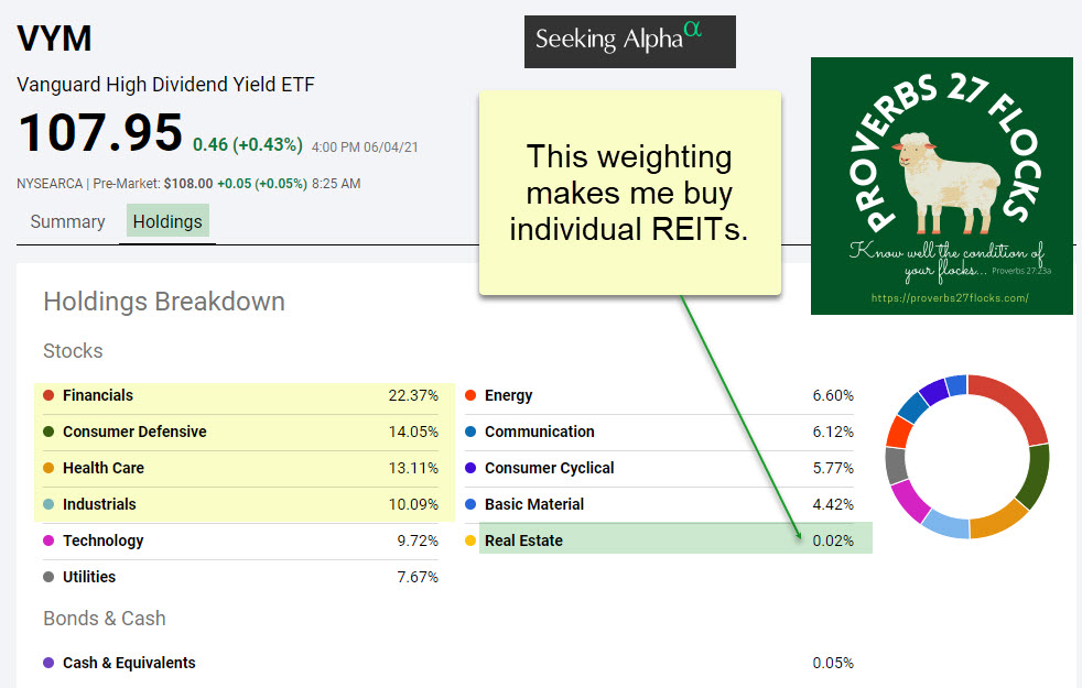 Sectors can make or break your investment results. I personally like financials, health care, industrials, technology, and real estate. I buy individual stocks in all of these sectors. However, I think VYM is too light in the Real Estate sector, so I invest more aggressively using individual stocks. If you don’t want to do that, buy a REIT ETF like VNQ (Vanguard Real Estate ETF) in addition to owning VYM.