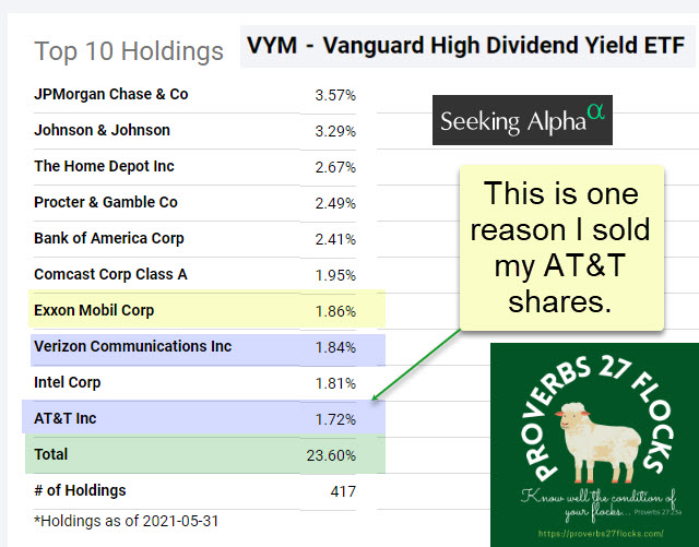 I like all of the investments in the top ten. Of course, XOM and T are not likely to out-perform the market. I recently sold most of our AT&T (T) stock, as VYM provides sufficient exposure to this investment. We also own shares in JNJ, HD, VZ, and INTC. Why does that matter? Because you want to be careful about your allocations and that includes both your stocks and your ETFs or mutual funds.