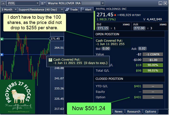 In May I sold two separate Put option contracts for PYPL shares. I repeated this in June two more times. Each time my contract price was greater as the prices increased: $240, $245, $250, and $255. In other words, each week I was willing to pay more for 100 shares if the share price dropped to that price. Because PYPL shares have been rising, I have not had to purchase the shares. However, I need cash (leverage) in my account as long as the option is open. Therefore, on June 11 I needed $25,500 in cash ($255 x 100 shares) to cover the put. Because PYPL closed Friday at $271.45, I did not have to buy the shares and I can repeat the process again if I desire. But don’t be hasty. Perhaps PYPL is ready for a pullback.