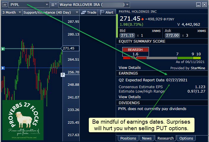 When you trade any options, be thoughtful about some dates. The two that I watch are the Ex-dividend date and the earnings announcement date. In general, I do not want to sell a covered call option on a dividend-paying investment and lose the dividend. I also don’t want to sell covered calls or puts when there is a near-term earnings announcement planned. Earnings can cause price volatility. Don’t sell contracts too far in the future. My longest contracts are usually less than a month long. Most expire at the end of the week.