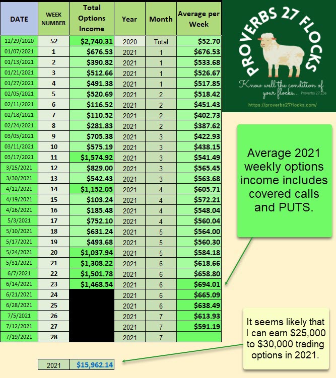We don’t need income from options to pay our bills. My Social Security and the dividends from our investments are more than enough. However, we seek to maximize our income so that we can maximize our giving. Selling covered calls and puts helps in that regard.