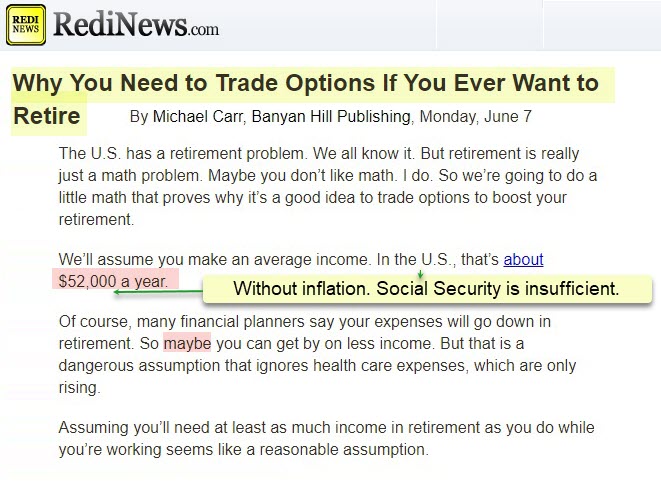 Why does this all matter? Michael Carr offers some helpful advice. He realizes that Social Security is and will be insufficient to meet your needs in retirement. Even dividends might fall short if your total assets in your 401(k) or IRA are insufficient for a good income stream. Therefore, he suggests a third source of income: OPTIONS contracts.