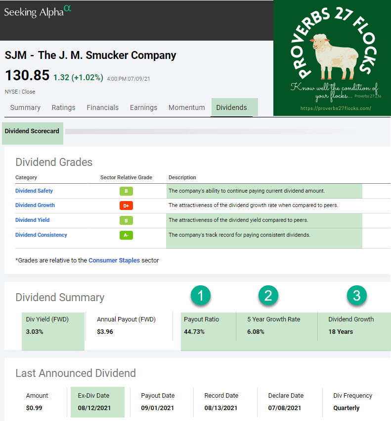 In this week’s edition of Barron’s, the following table appears. I already knew that SJM had increased their dividend before I read Barron’s. That is because I received a Seeking Alpha alert about the dividend increase. I have been watching SJM for some time. In February of this year I bought 100 SJM shares. I then sold a covered call on the shares, and my shares were called away a month later. Therefore, I realized a short-term IRA profit on the sale of the SJM shares and received the covered call option income as well. When I saw the dividend announcement, I bought 100 shares of SJM.