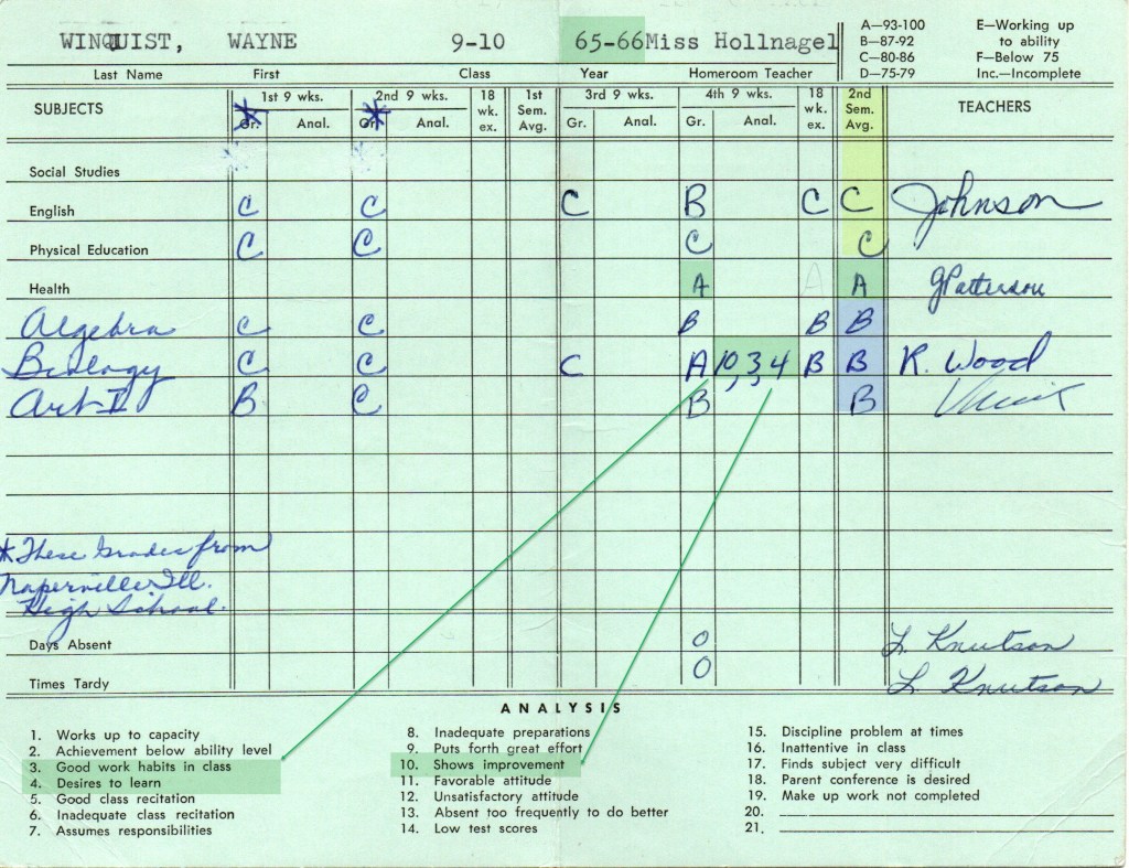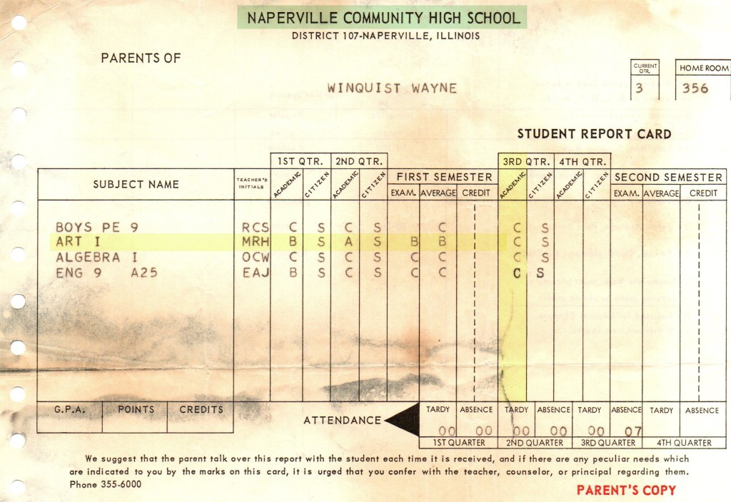 Our family moved from Naperville to New Berlin Wisconsin during my freshman year. I was dismayed that I went from a “high school” to a “junior high school in Brookfield Wisconsin. At Pilgrim Park, 9th grade was probably there because the high school was overcrowded. Because I had fewer friends, and less distractions, I studied a bit more. However, I would classify my study as faster coasting.