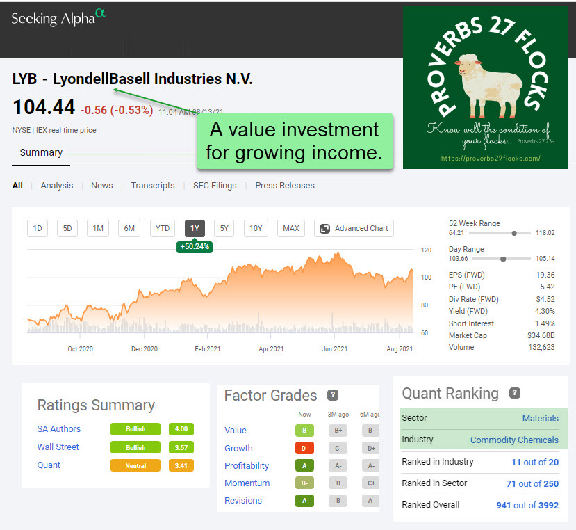 In addition, LYB is a potential source of income from selling covered calls. In May of this year I sold two different covered calls on my LYB shares, generating $98.62 in income in two weeks. I stopped trading covered calls on the shares, but I could easily restart this and add income that will be tax-free in my ROTH IRA.