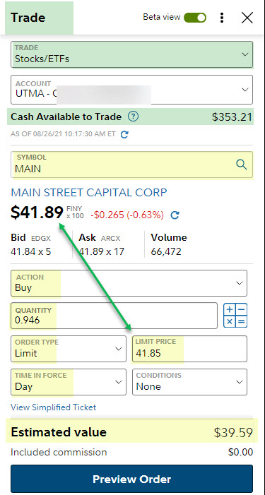 The second reason was that I turned off automatic dividend reinvestment on MAIN so that MAIN’s monthly dividend will come into the UTMA accounts as cash. That way I can decide how much I want to pay for shares of MAIN. The price on the day the dividend is paid might not be advantageous. It is better to buy partial shares, as there is no commission on buy or sell orders.