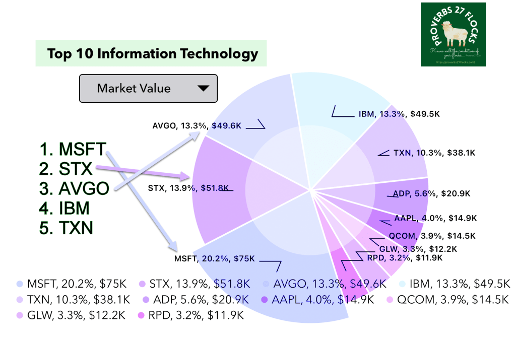 Today our combined investment accounts hold MSFT, STX, AVGO, IBM, and TXN as our top five technology investments. If you were to look at the businesses, you would find that they are more different than similar. The exceptions are AVGO and TXN, as they are both in the semiconductor industry. IBM is a consulting technology company, STX is technology hardware and storage, and MSFT is system software. Notice the diversification within the sector.