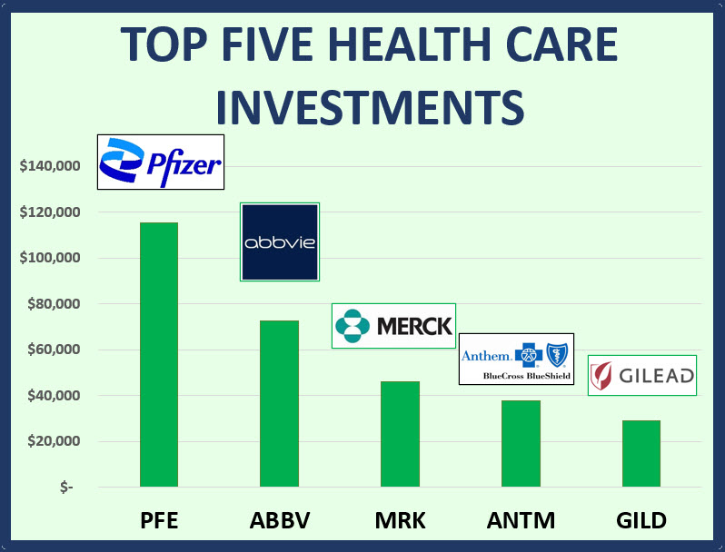 Today our combined investment accounts hold PFE, ABBV, MRK, ANTM, and GILD as our top five health care investments. This does not include our investments in MPW or CTRE, which are REITs. If you were to look at the businesses, you would find that they are more different than similar. Although they are all focused on health care, PFE and MRK are classified as Pharmaceuticals, ABBV and GILD are Biotechnology and ANTM is Managed Health Care. As with my technology top five in yesterday’s post, there is diversification within the sector.